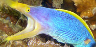 Jaws!...down in a hole in the Sulu Sea. This is one the largest of the Jawfish family, Opistognathidae we've seen. Pulau Lankayan, Malaysian Borneo.