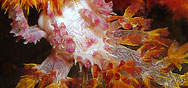 This decorator crab, Hoplophrys oatesii, smaller than a 5¢ coin, has soft coral grown on its back for camouflage. Location of this fragile little critter is undisclosed for its preservation.