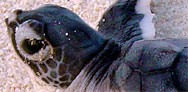 Freshly hatched green turtle, Chelonia mydas, making a sunset dash for the waters at Lankayan.