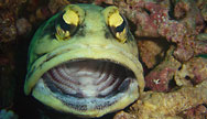 Jaws!...down in a hole in the Sulu Sea. This is one the largest of the Jawfish family, Opistognathidae we've seen. Pulau Lankayan, Malaysian Borneo.